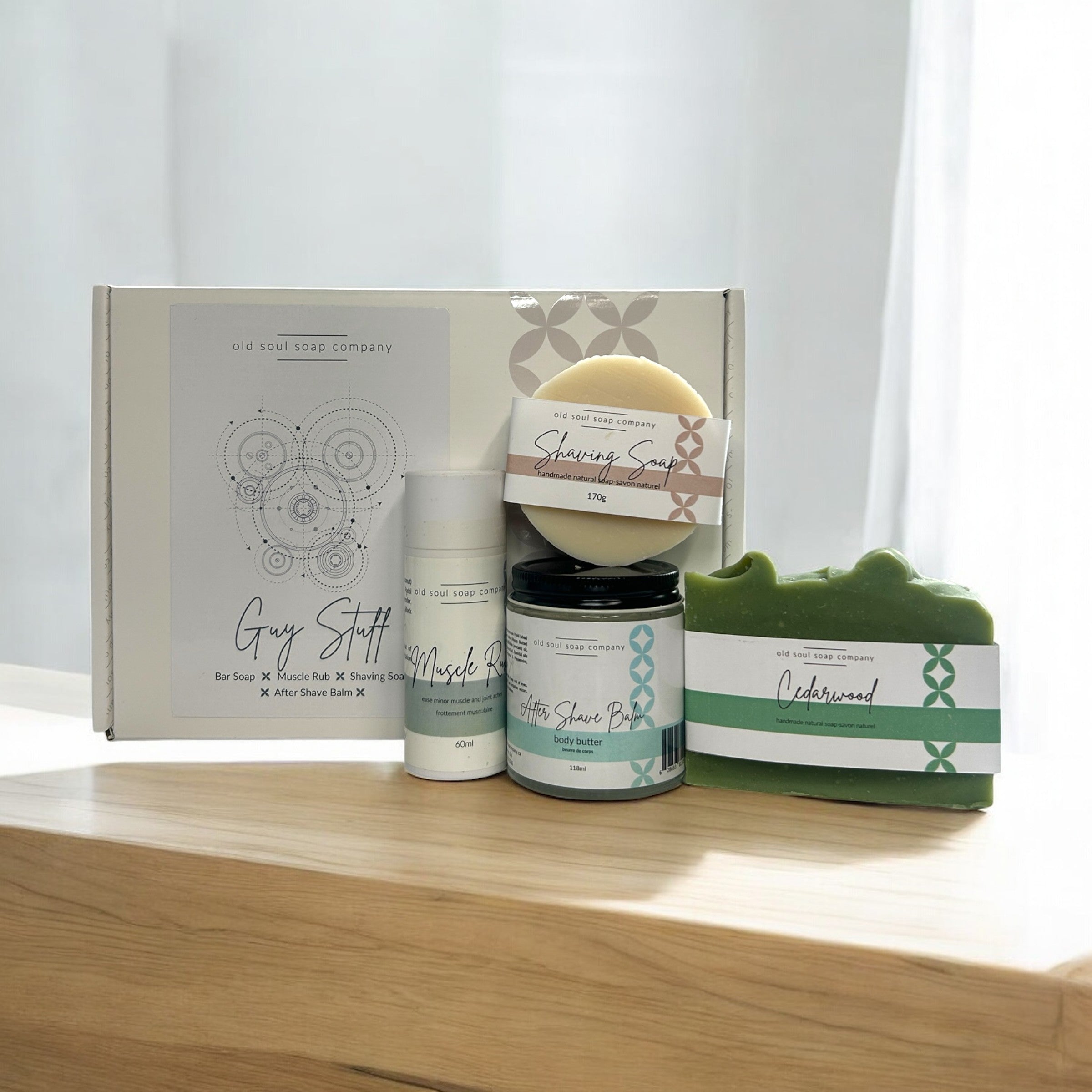 The ultimate grooming box for men, featuring manly soap, shaving soap, after shave butter, and muscle rub—everything you need to look good and feel great.